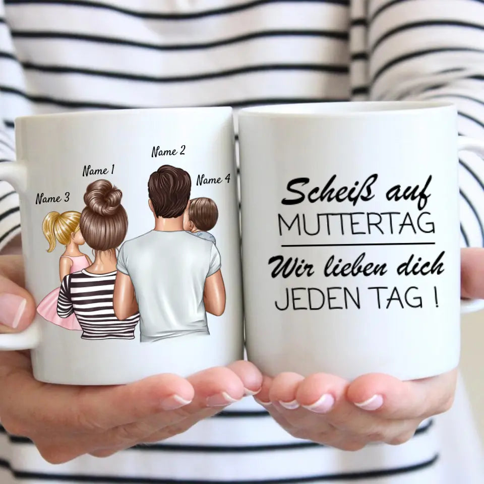 Scheiss auf Muttertag, wir lieben dich jeden Tag - Personalisierte Familien Tasse (Eltern mit 1-4 Kinder)